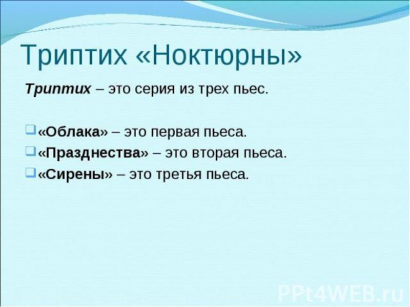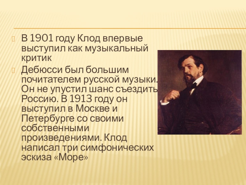 Россию. В 1913 году он выступил в Москве и Петербурге со своими собственными произведениями. Клод написал три симфонических эскиза «Море»