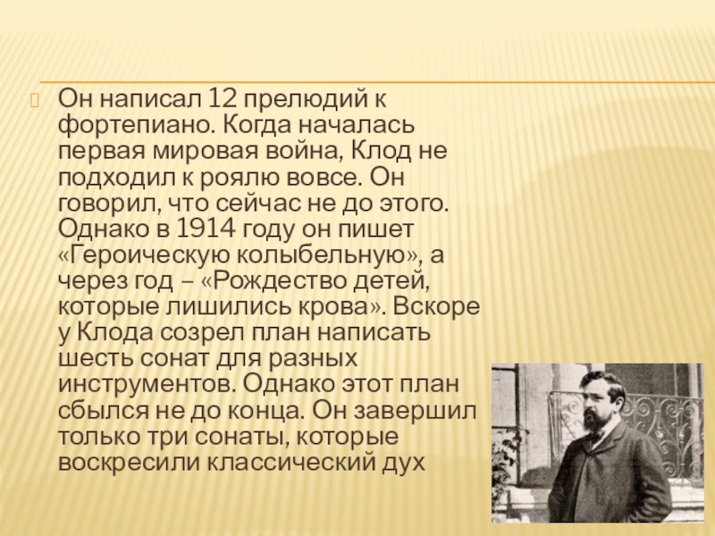Он написал 12 прелюдий к фортепиано. Когда началась первая мировая война, Клод не подходил к роялю вовсе.