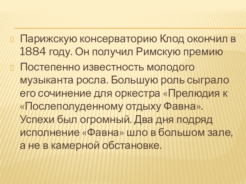 Парижскую консерваторию Клод окончил в 1884 году. Он получил Римскую премиюПостепенно известность молодого музыканта росла. Большую роль