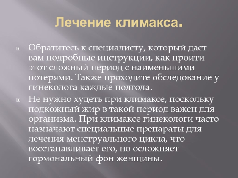 Не нужно худеть при климаксе, поскольку подкожный жир в такой период важен для организма. При климаксе гинекологи часто назначают специальные препараты для лечения менструального цикла, что восстанавливает его, но осложняет гормональный фон женщины.