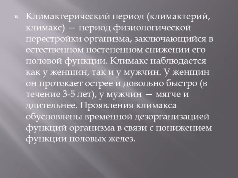 Слайд 2Климактерический период (климактерий, климакс) — период физиологической перестройки организма, заключающийся