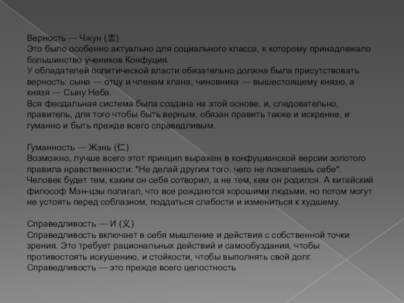 должна была присутствовать верность: сына — отцу и членам клана, чиновника — вышестоящему князю, а князя — Сыну Неба.