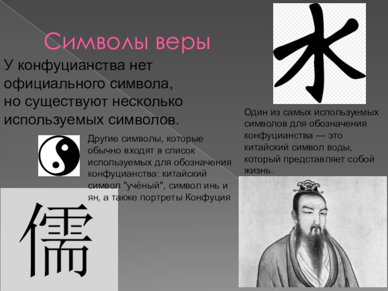 Другие символы, которые обычно входят в список используемых для обозначения конфуцианства: китайский символ "учёный", символ инь и ян, а также портреты Конфуция