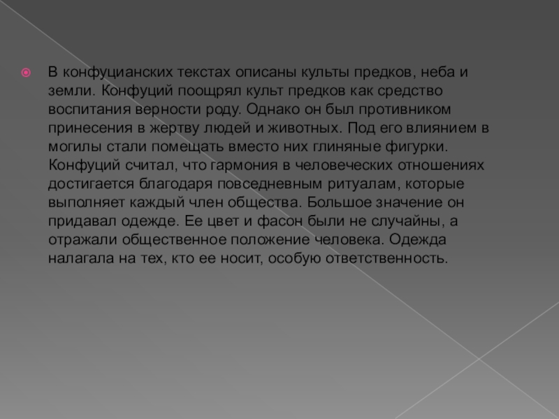 был противником принесения в жертву людей и животных. Под его влиянием в могилы стали помещать вместо них глиняные фигурки. Конфуций считал, что гармония в человеческих отношениях достигается благодаря повседневным ритуалам, которые выполняет каждый член общества. Большое значение он придавал одежде. Ее цвет и фасон были не случайны, а отражали общественное положение человека. Одежда налагала на тех, кто ее носит, особую ответственность.