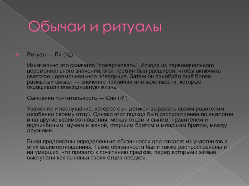 особое внимание любви к человечеству, поклонению предкам и почитанию родителей, гармонии мысли и поведения.