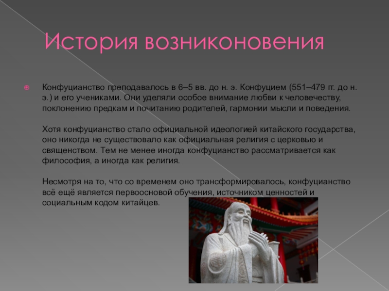 Конфуцианство преподавалось в 6–5 вв. до н. э. Конфуцием