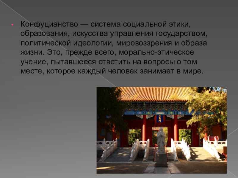 Слайд 2Конфуцианство — система социальной этики, образования, искусства управления государством, политической