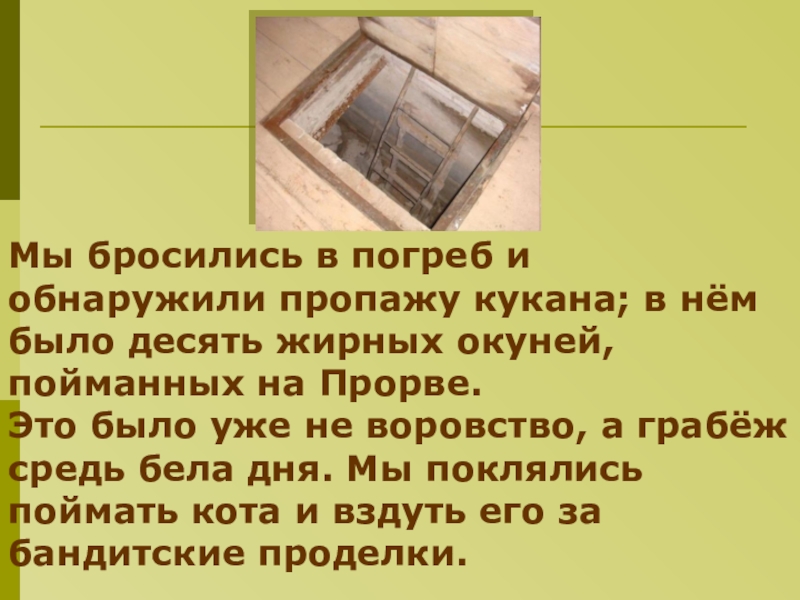 Слайд 6Мы бросились в погреб и обнаружили пропажу кукана; в нём