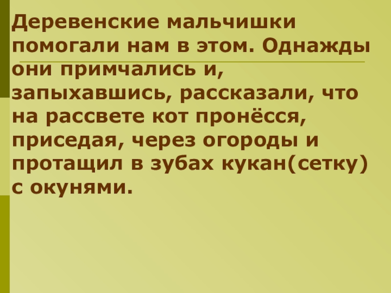 Слайд 5Деревенские мальчишки помогали нам в этом. Однажды они примчались и,