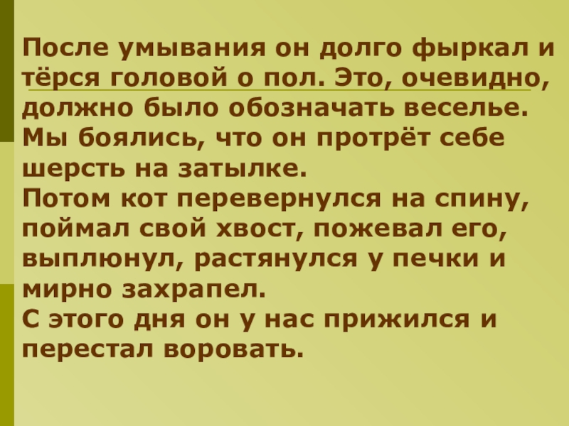 Слайд 16После умывания он долго фыркал и тёрся головой о пол.