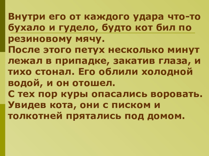 Кот нёсся за ним на трех лапах, а четвёртой, передней лапой бил петуха по спине. От петуха летели пыль и пух.