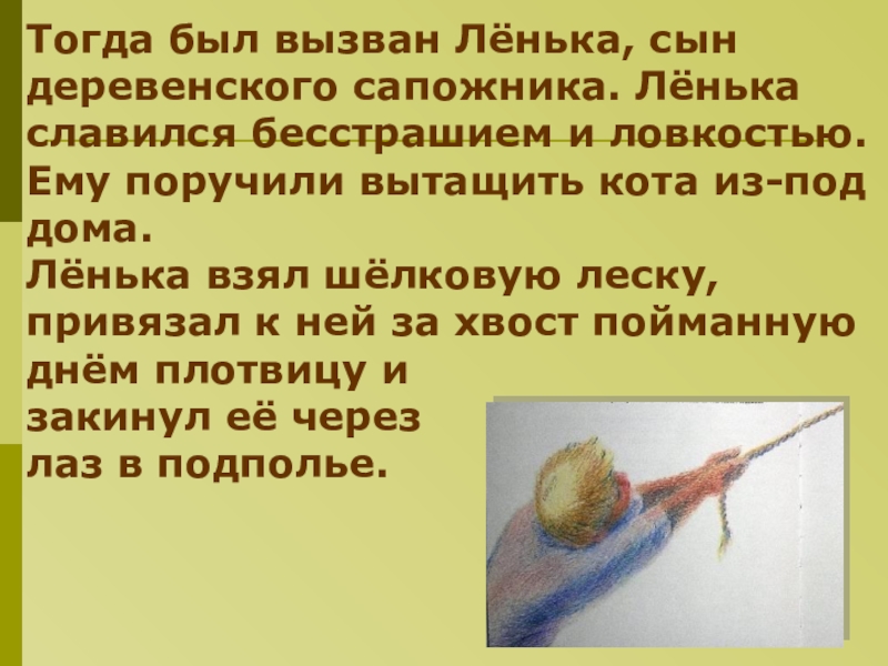 Слайд 10Тогда был вызван Лёнька, сын деревенского сапожника. Лёнька славился бесстрашием