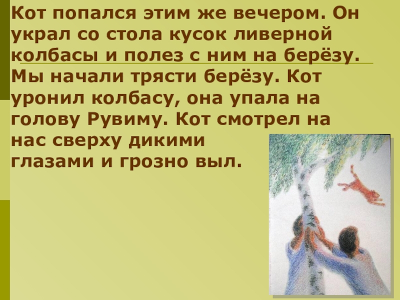 берёзу. Кот уронил колбасу, она упала на голову Рувиму. Кот смотрел на
