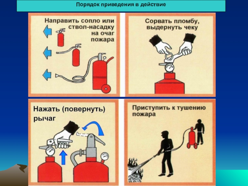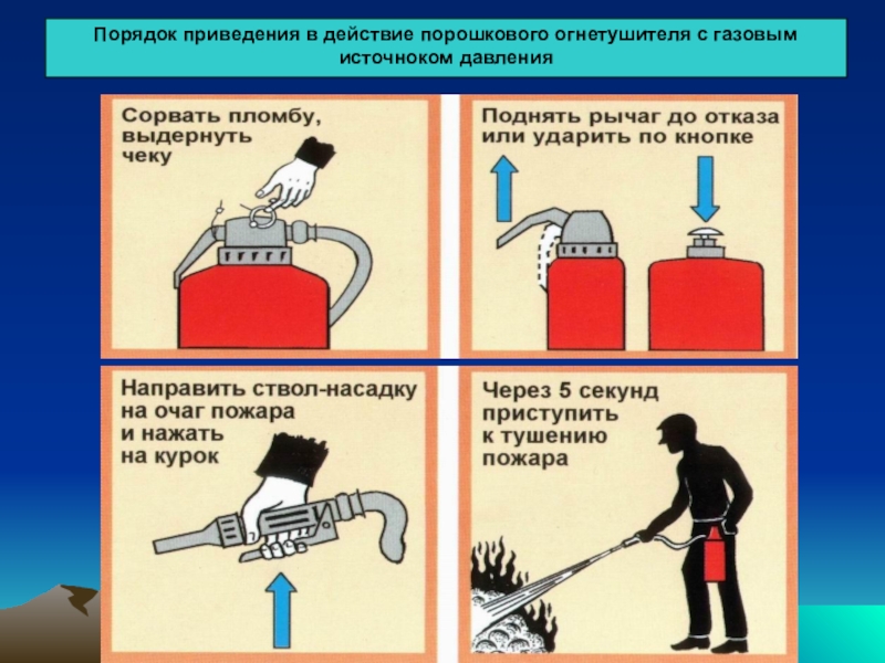 Слайд 12Порядок приведения в действие порошкового огнетушителя с газовым источноком давления