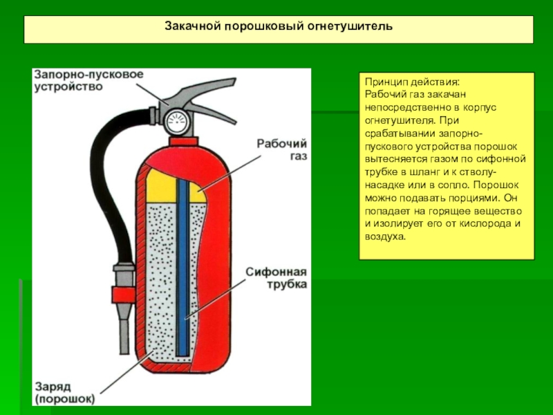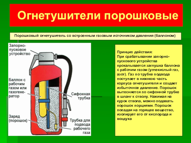 нижнюю часть корпуса огнетушителя и создает избыточное давление. Порошок вытесняется по сифонной трубке в шланг к стволу. Нажимая на курок ствола, можно подавать порошок порциями. Порошок попадая на горящее вещество, изолирует его от кислорода и воздуха
