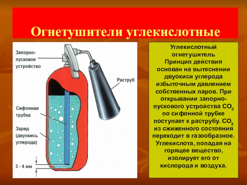 сифонной трубке поступает к раструбу. СО2 из сжиженного состояния переходит в газообразное. Углекислота, попадая на горящее вещество, изолирует его от кислорода и воздуха.