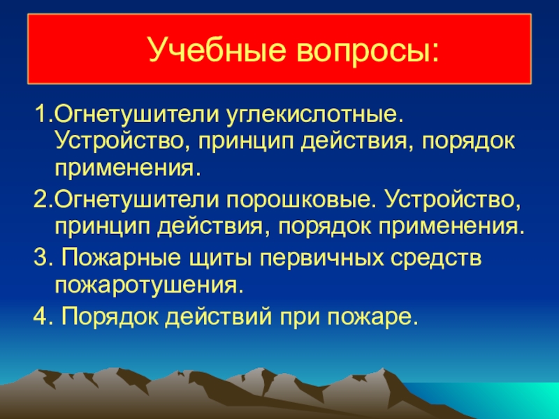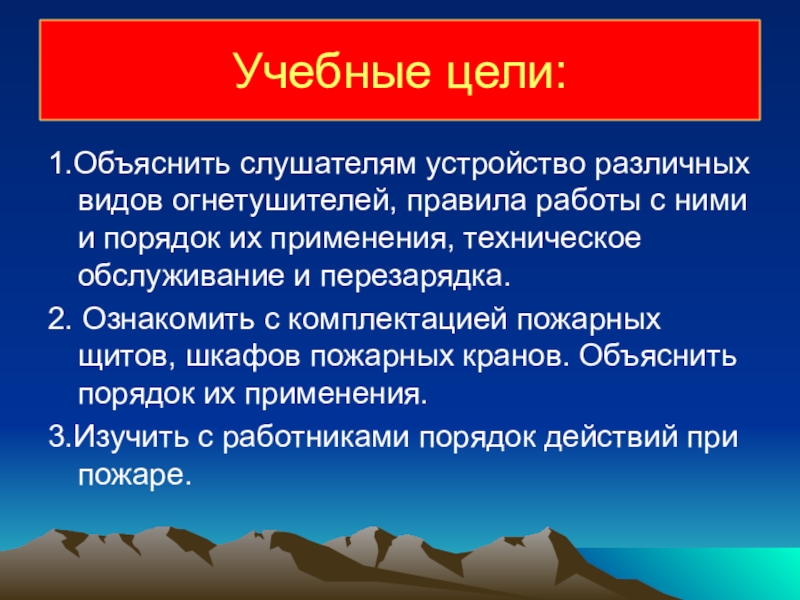 1.Объяснить слушателям устройство различных видов огнетушителей, правила работы с