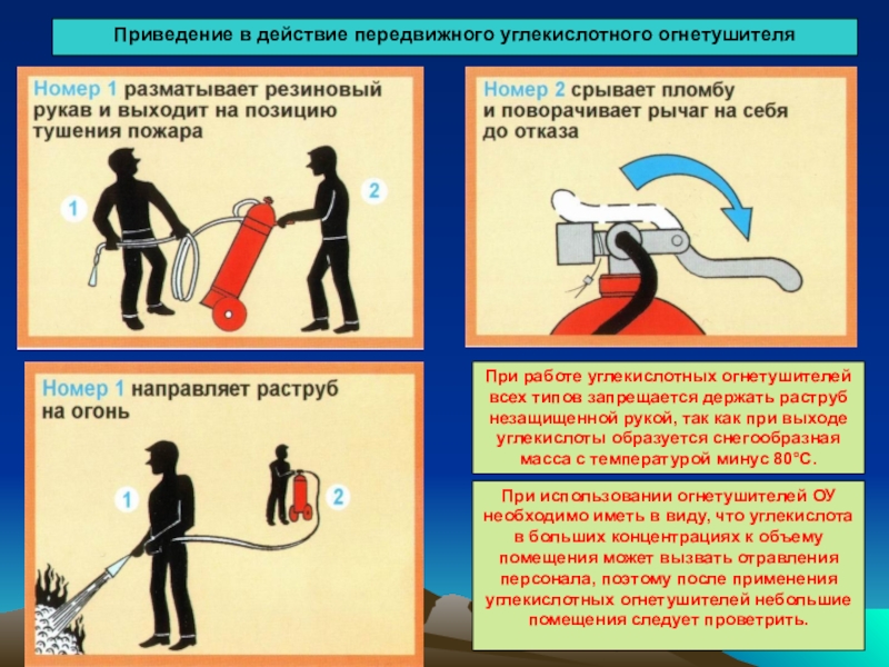 При использовании огнетушителей ОУ необходимо иметь в виду, что углекислота в больших концентрациях к объему помещения может вызвать отравления персонала, поэтому после применения углекислотных огнетушителей небольшие помещения следует проветрить.