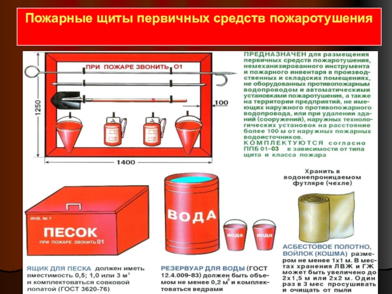 Слайд 17Пожарные щиты первичных средств пожаротушения