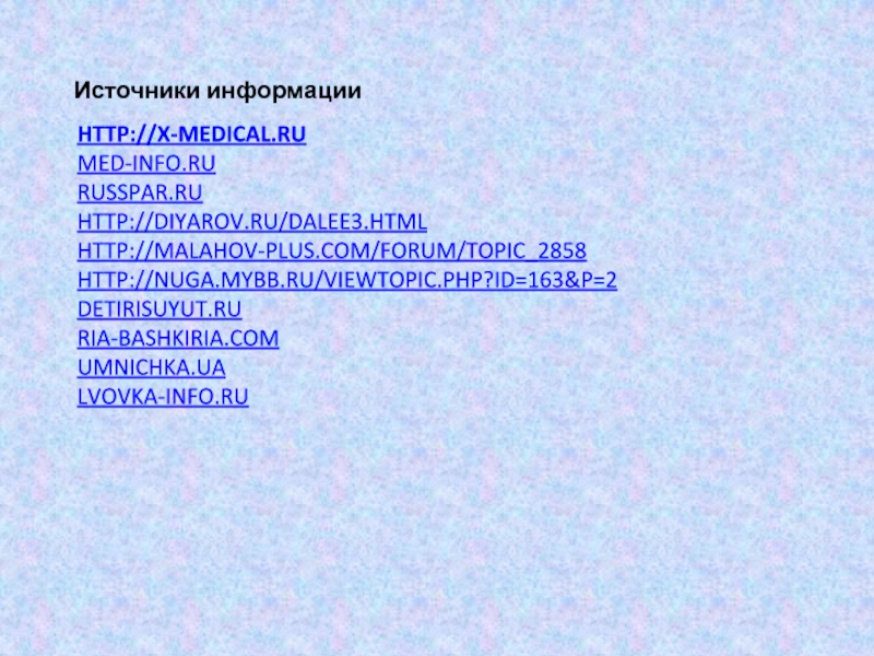 http://x-medical.ru med-info.ru russpar.ru http://diyarov.ru/dalee3.html http://malahov-plus.com/forum/topic_2858 http://nuga.mybb.ru/viewtopic.php?id=163&p=2 detirisuyut.ru ria-bashkiria.com umnichka.ua lvovka-info.ru  Источники информации