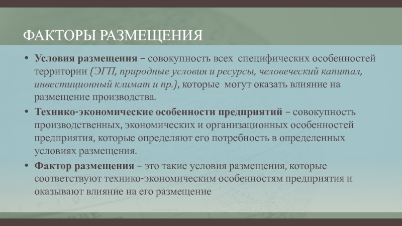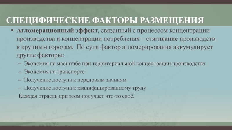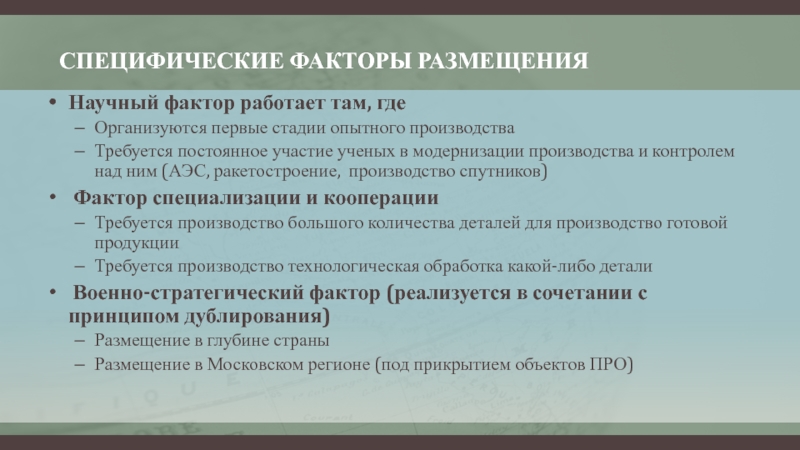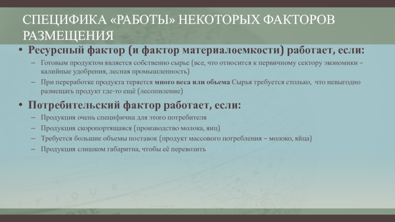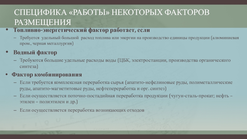 Слайд 26Специфика «работы» некоторых факторов размещения