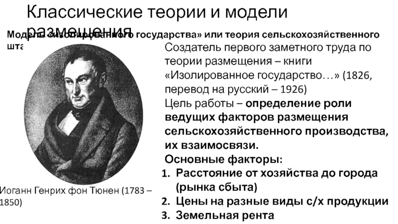 по теории размещения – книги «Изолированное государство…» (1826, перевод на русский – 1926)