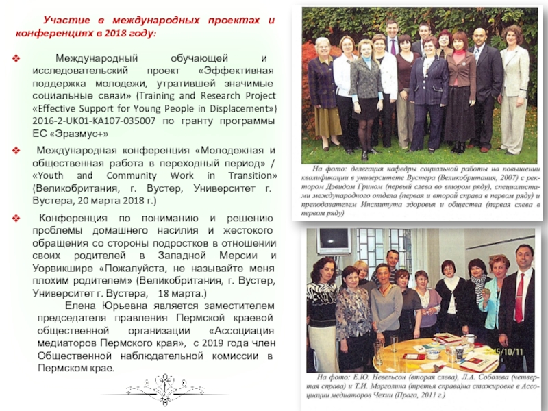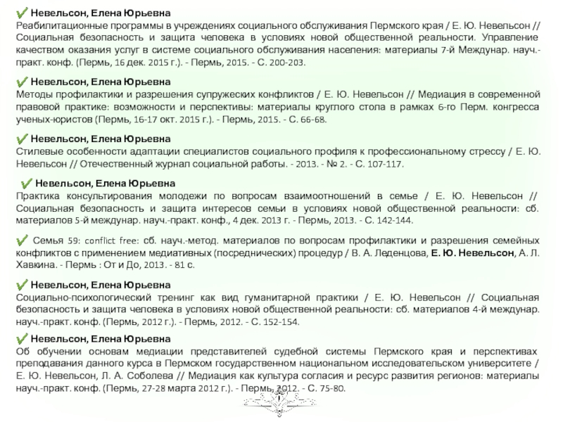 Методы работы с конфликтами пожилых людей / Е. Ю. Невельсон, Л. А. Соболева // Медиация как культура согласия: урегулирования конфликтов на местном уровне : сб. ст. и материалы междунар. науч.-практ. конф., 24-25 апр. 2018 г. - Пермь, 2018. - С. 106-109.