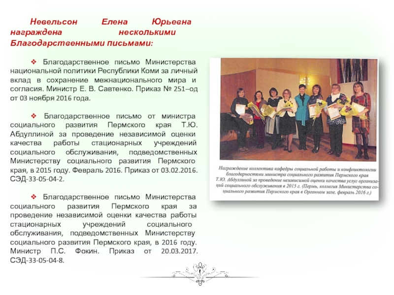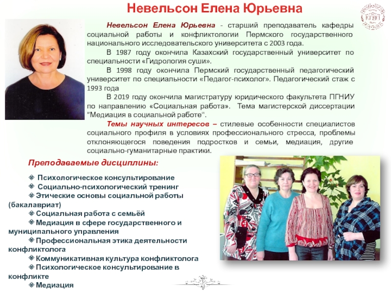 Особенности конфликтологического консультирования пожилых людей (на примере конкретного случая) / Е. Ю. Невельсон // Медиация как культура согласия: урегулирования конфликтов на местном уровне : сб. ст. и материалы междунар. науч.-практ. конф., 24-25 апр. 2018 г. - Пермь, 2018. - С. 143-145.