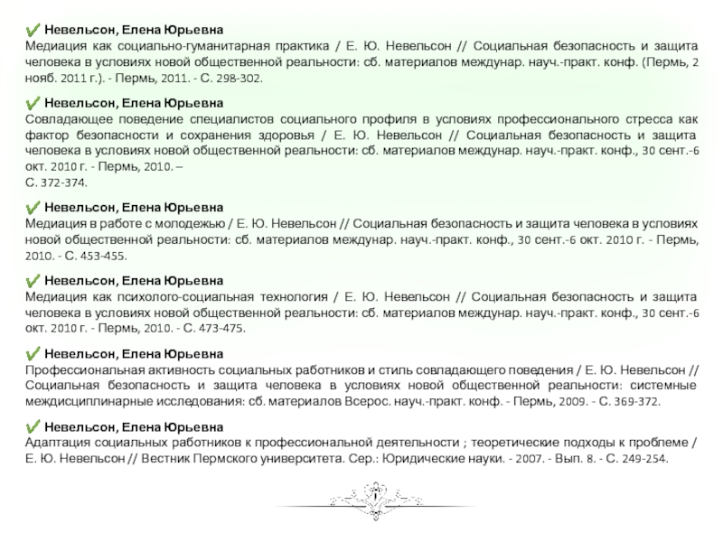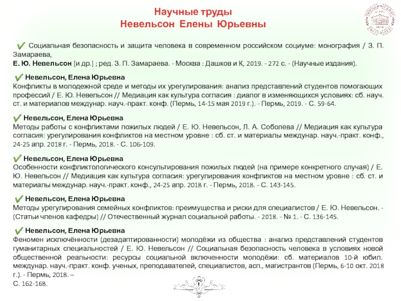Конфликты в молодежной среде и методы их урегулирования: анализ представлений студентов помогающих профессий / Е. Ю. Невельсон // Медиация как культура согласия : диалог в изменяющихся условиях: сб. науч. ст. и материалов междунар. науч.-практ. конф. (Пермь, 14-15 мая 2019 г.). - Пермь, 2019. - С. 59-64.
