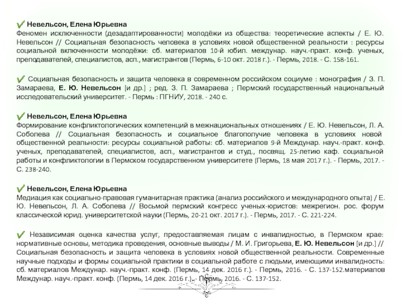 Феномен исключённости (дезадаптированности) молодёжи из общества : анализ представлений студентов гуманитарных специальностей / Е. Ю. Невельсон // Социальная безопасность человека в условиях новой общественной реальности: ресурсы социальной включенности молодёжи: сб. материалов 10-й юбил. междунар. науч.-практ. конф. ученых, преподавателей, специалистов, асп., магистрантов (Пермь, 6-10 окт. 2018 г.). - Пермь, 2018. –