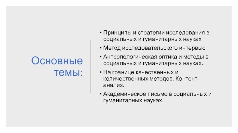 Основные темы:Принципы и стратегии исследования в социальных и гуманитарных наукахМетод исследовательского интервьюАнтропологическая оптика и методы в социальных