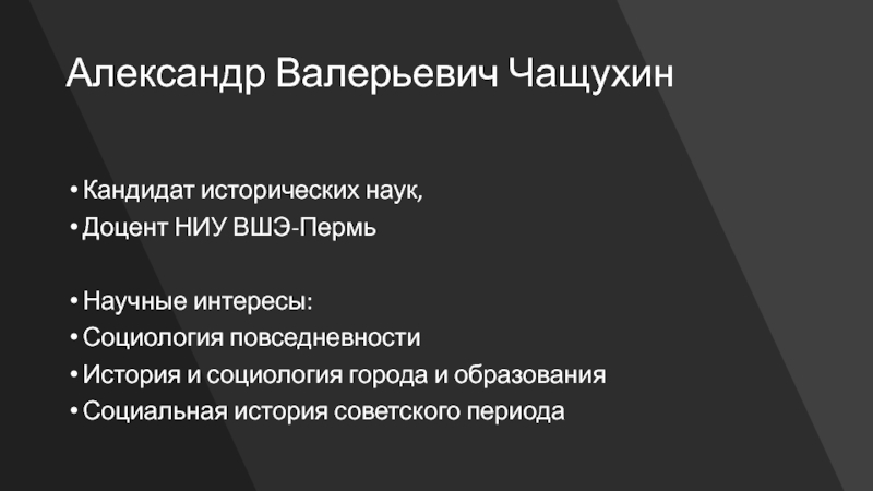 Александр Валерьевич ЧащухинКандидат исторических наук,Доцент НИУ ВШЭ-ПермьНаучные интересы:Социология повседневностиИстория и социология города и образованияСоциальная история советского периода