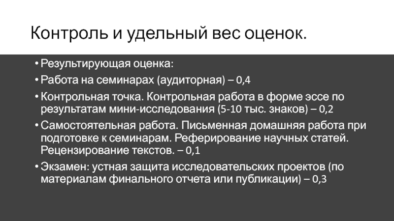 Контроль и удельный вес оценок.Результирующая оценка: Работа на семинарах (аудиторная) – 0,4Контрольная точка. Контрольная работа в форме