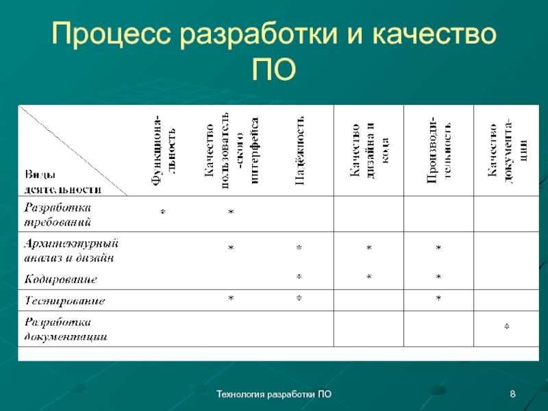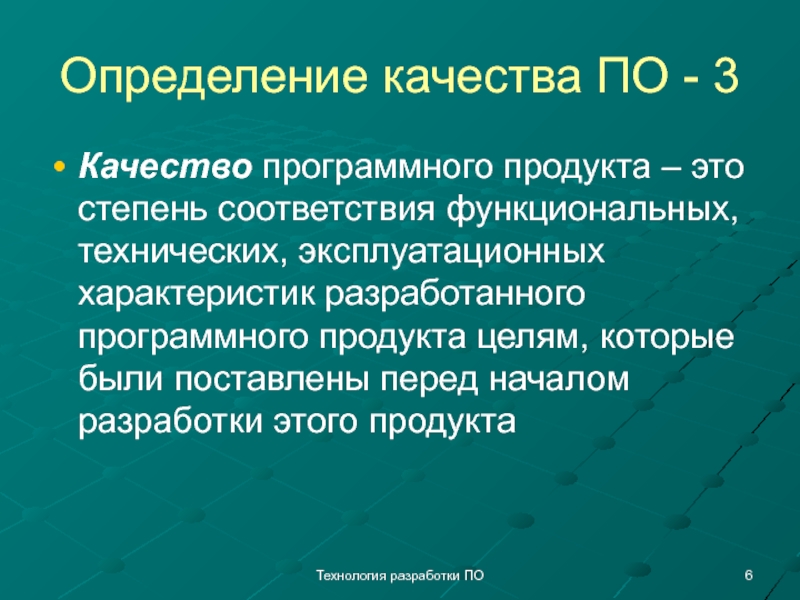 документированным стандартам разработки, и неявным характеристикам, которые ожидаются от всех профессионально разработанных программных продуктов (Pressman)