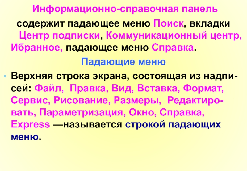 Основной инструмент данного интерфейса-лента. Это самый сложный тип меню, предоставляющий доступ к командам системы через свои кнопки, сгруппированные в панели, а панели объединены в группы (вкладки ). Лента может менять свой вид и даже не присутствовать на экране. Ее состав не фиксирован и может быть подстроен под конкрет-ного пользователя с помощью операции адаптации пользовательского интерфейса.