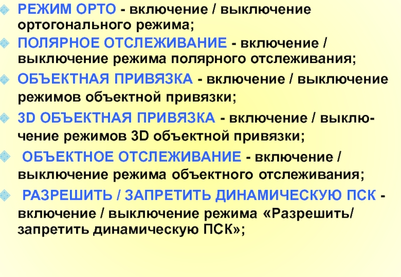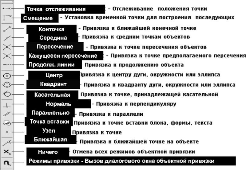Панель инструментов объектной привязки со-держит следующие режимы: