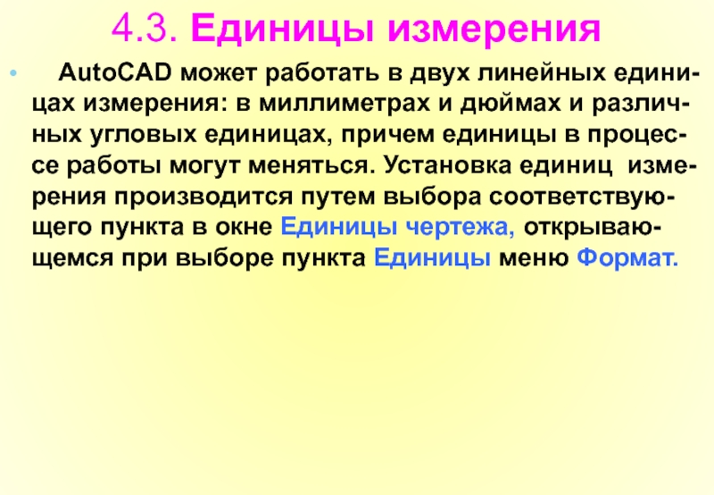 единицах, причем единицы в процес-се работы могут меняться. Установка единиц изме-рения производится путем выбора соответствую-щего пункта в окне Единицы чертежа, открываю-щемся при выборе пункта Единицы меню Формат.