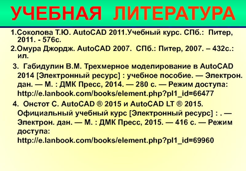 4. Онстот С. AutoCAD ® 2015 и AutoCAD LT ® 2015. Официальный учебный курс [Электронный ресурс] : . — Электрон. дан. — М. : ДМК Пресс, 2015. — 416 с. — Режим доступа: http://e.lanbook.com/books/element.php?pl1_id=69960