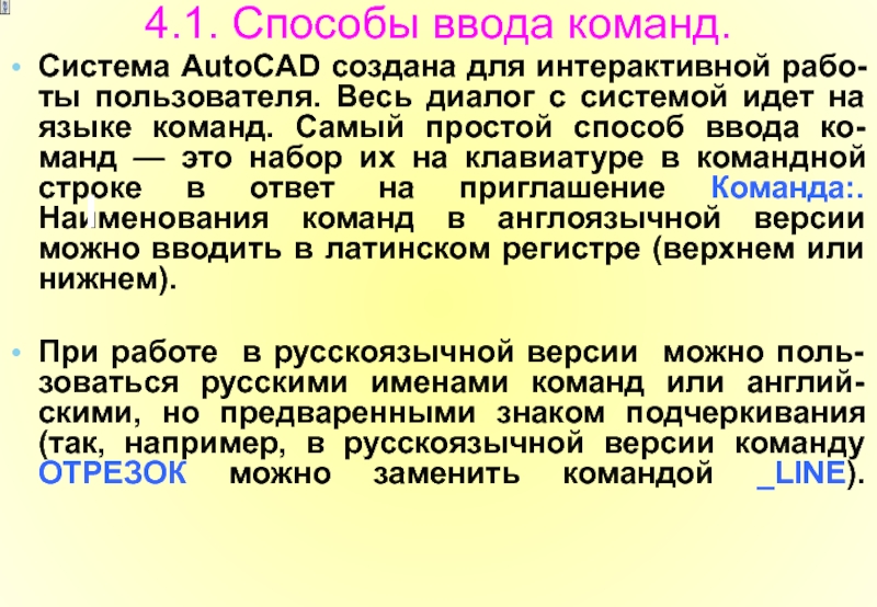 При работе в русскоязычной версии можно поль-зоваться русскими именами команд или англий-скими, но предваренными знаком подчеркивания (так, например, в русскоязычной версии команду ОТРЕЗОК можно заменить командой _LINE).