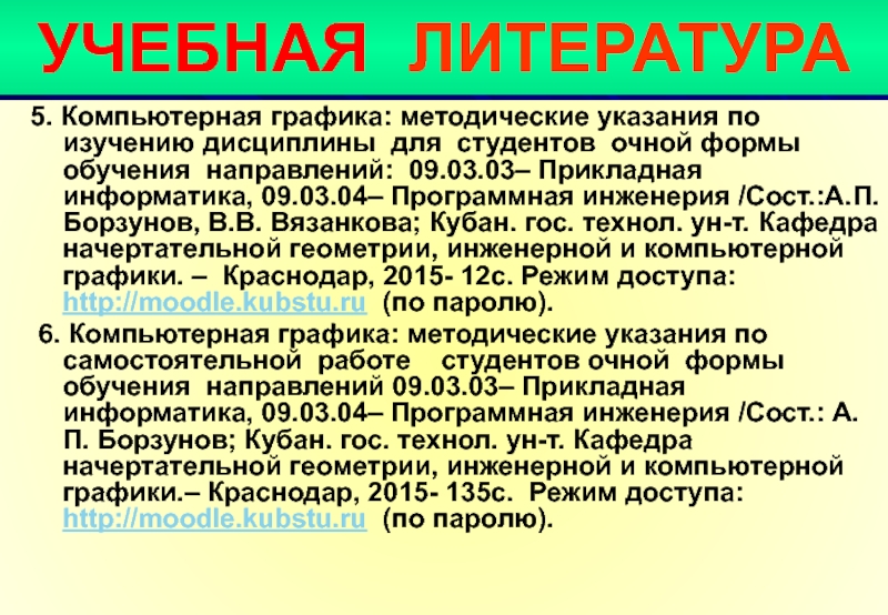 6. Компьютерная графика: методические указания по самостоятельной работе студентов очной формы обучения направлений 09.03.03– Прикладная информатика, 09.03.04– Программная инженерия /Сост.: А.П. Борзунов; Кубан. гос. технол. ун-т. Кафедра начертательной геометрии, инженерной и компьютерной графики.– Краснодар, 2015- 135с. Режим доступа: http://moodle.kubstu.ru (по паролю).