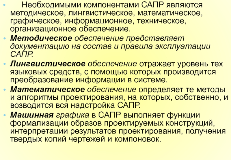 Слайд 14 Необходимыми компонентами САПР являются методическое, лингвистическое, математическое,