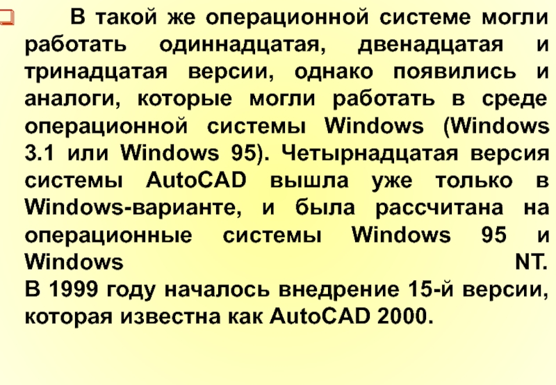 могли работать в среде операционной системы Windows (Windows 3.1 или Windows 95). Четырнадцатая версия системы AutoCAD вышла уже только в Windows-варианте, и была рассчитана на операционные системы Windows 95 и Windows NT.