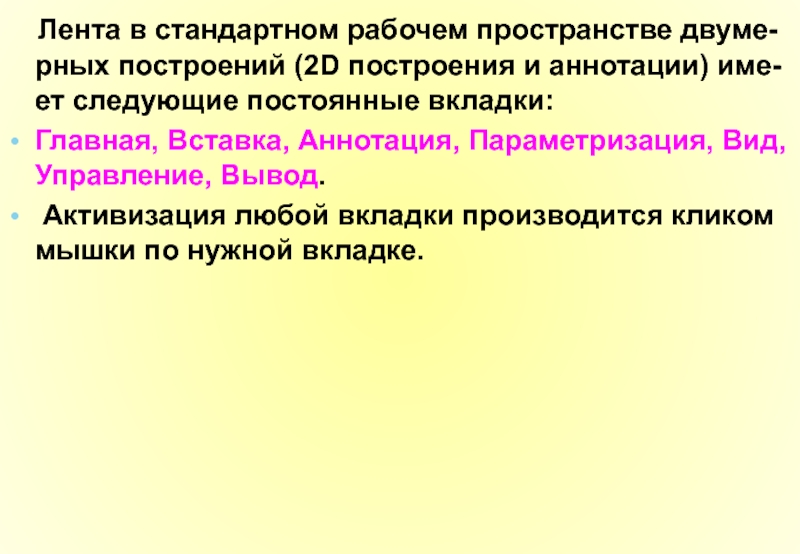 Слайд 70 Лента в стандартном рабочем пространстве двуме-рных построений (2D