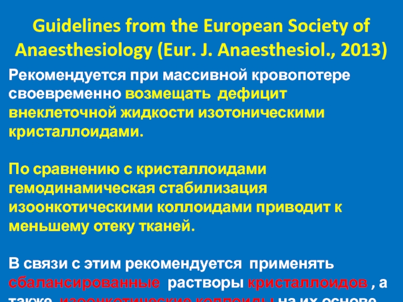 В связи с этим рекомендуется применять сбалансированные растворы кристаллоидов , а также изоонкотические коллоиды на их основе.