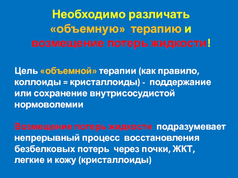 Слайд 8Необходимо различать «объемную» терапию и возмещение потерь жидкости!