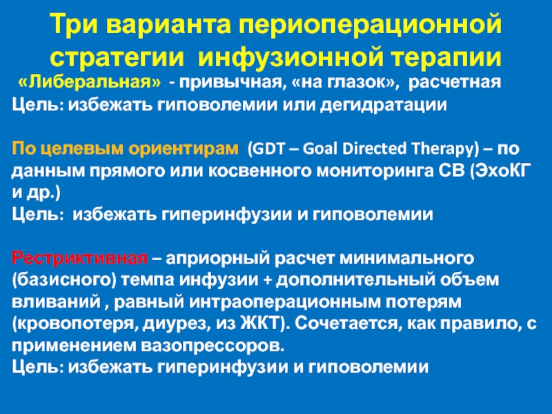 Слайд 5Три варианта периоперационной стратегии инфузионной терапии