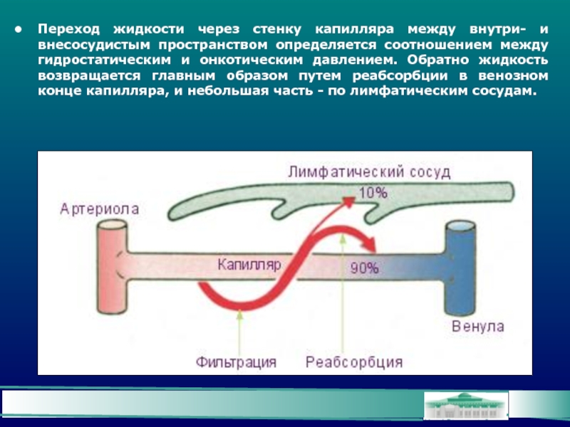 определяется соотношением между гидростатическим и онкотическим давлением. Обратно жидкость возвращается