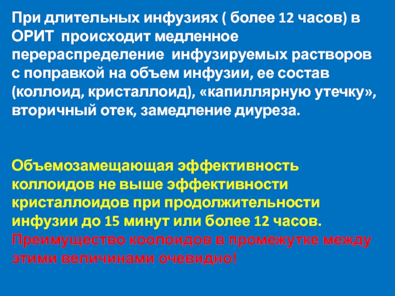 Объемозамещающая эффективность коллоидов не выше эффективности кристаллоидов при продолжительности инфузии до 15 минут или более 12 часов.