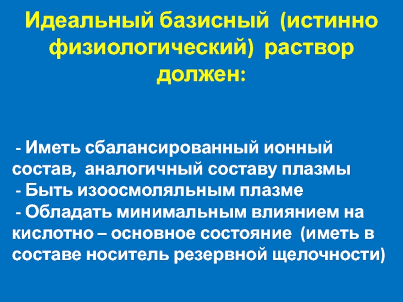 Слайд 28Идеальный базисный (истинно физиологический) раствор должен: