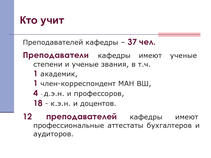 12 преподавателей кафедры имеют профессиональные аттестаты бухгалтеров и аудиторов.